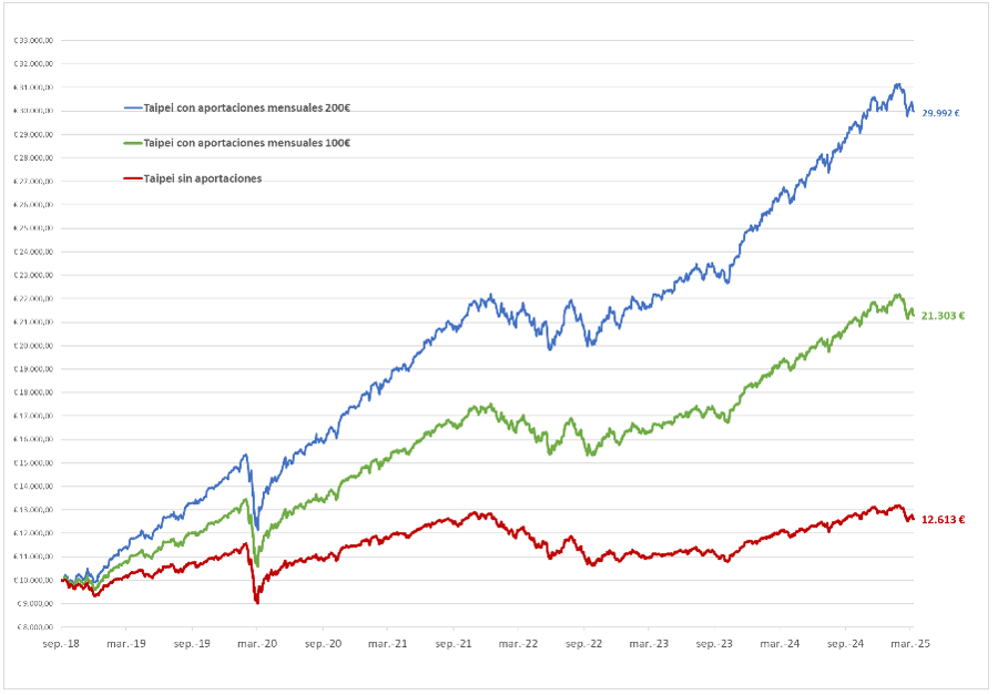 | Taipei con aportaciones mensuales 200 € | Taipei con aportaciones mensuales 100 € | Taipei sin aportaciones |
